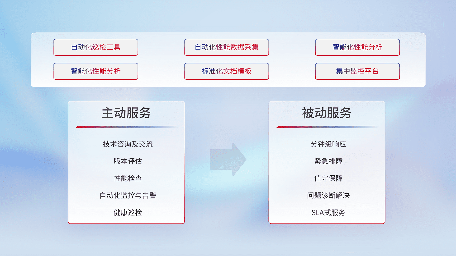 智能化工具和标准化文档,,,保障服务质量,,,提供主动服务(包含技术咨询、、版本评估、、、性能检查、、、、自动化监控与告警、、、健康巡检)和被动服务包含(分钟级响应、、、、紧急排障、、、、值守保障、、问题诊断解决、、、SLA服务)。。